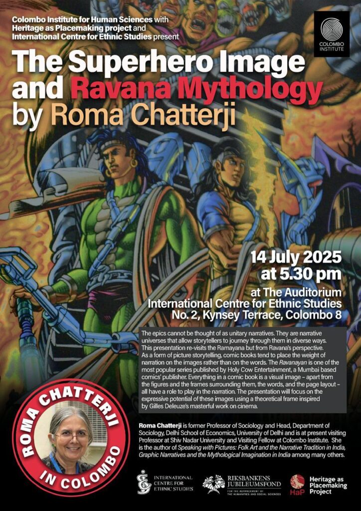 Colombo Institutes collaborates with the International Centre for Ethnic studies in organizing lectures and discussions at its premises in Colombo 8. The last such event was Prof Roma Chatterji’s lecture on 14 July 2025 focused on the theme, ‘The Superhero Image and Ravana Mythology’ during which prof Chatterji explored how visual narratives reshape.